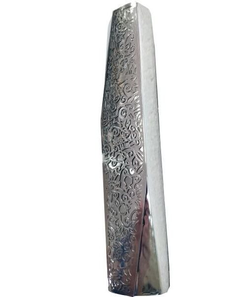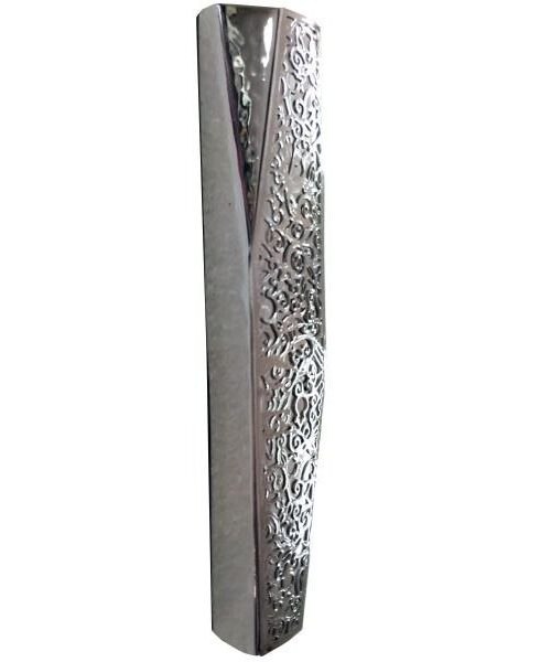 בית מזוזה מעוצב עבודת פטיש בשילוב נגזרת רימונים נירוסטה עם קצוות זוויתיים. בעל פתח עליון להכנסת קלף בגודל 12 ס"מ. מגיע עם דבק דו צדדי בחלק האחורי להדבקה על משקוף הדלת. מידות: 2X3X15 ס"מ.