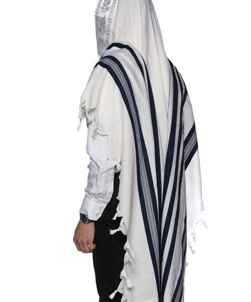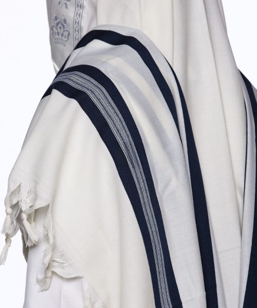 המוצר שלך: טלית צמר פאר קל פסים כחולים דגם ישתבח
