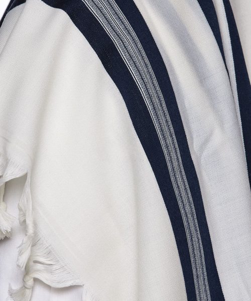 טלית 100% צמר פאר קל באריגה עדינה המעניקה מראה עשיר לטלית בשילוב פסי צבע כחולים, בשילוב גימור עיטורים לבנים עדינים על עטרת הטלית בכשרות מהודרת!