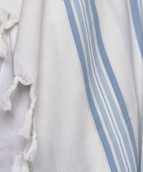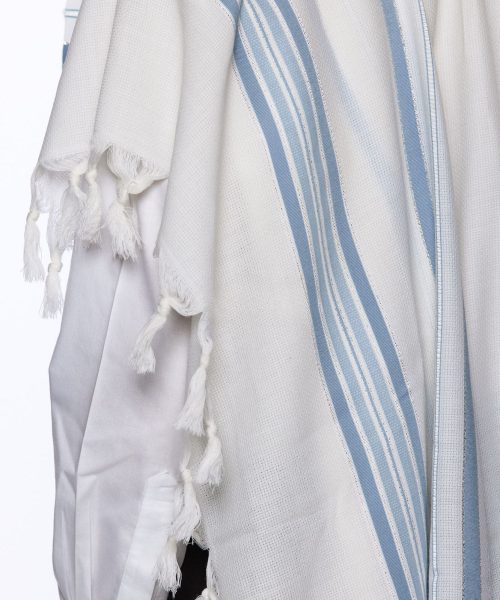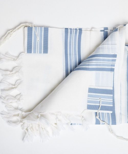 המוצר שלך: טלית צמר תשבץ פסים תכלת דגם למנצח