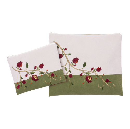 כיסוי לטלית ותפילין בצבעים אופוויט חצי כחול / חצי אפור / חצי ירוק בעיטור רימונים עשוי בד קלטינקס איכותי, מגיע עם ניילון קשיח לשמירה מקסימלית.