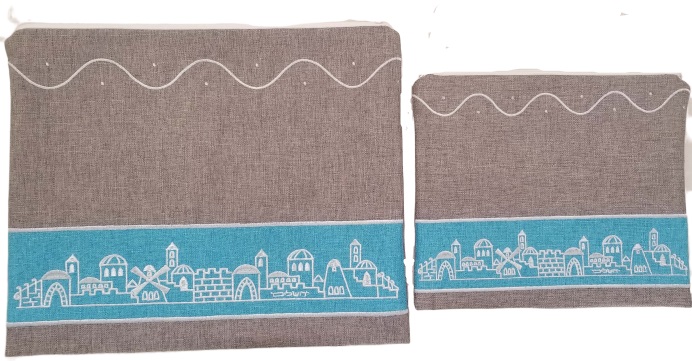 סט תיק טלית תפילין פישתן בצבע בז' דגם ירושלים. ניתן להוסיף רקמת שם. משמש להידור מצוות הנחת טלית ותפילין. ולהגנה ושמירה.