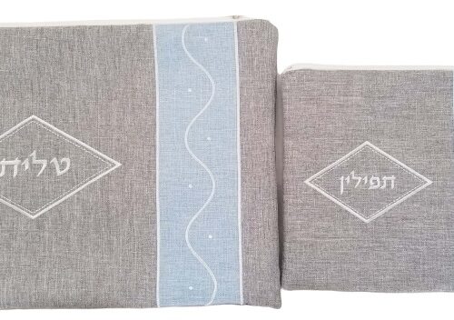 סט תיק טלית תפילין פישתן דגם שבלול קיים בצבעים: חום, חום – תכלת. ניתן להוסיף רקמת שם. משמש להידור מצוות הנחת טלית ותפילין. ולהגנה ושמירה.